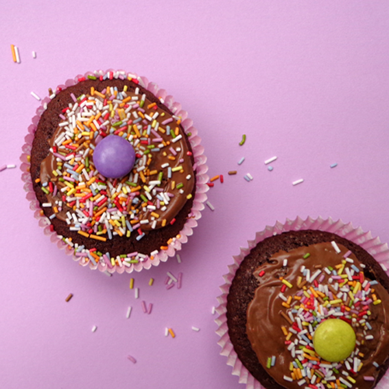 Mehl und Kakaopulver in eine Schüssel sieben. Zucker, Margarine, Milch und Eier hinzufügen und gut verrühren. Backpulver hinzufügen und nochmal verrühren. Den Teig in Papierförmchen füllen und 10-15 Minuten bei 175° auf der mittleren Schiene backen. Danach abkühlen lassen und mit Kuvertüre, Streuseln und Smarties verzieren.