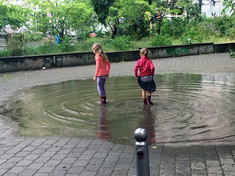 Ein paar Tage später regnet es wie aus Kübeln und es bilden sich an manchen, durchaus unerwarteten Stellen, riesige Pfützen. Die Pfütze die sich plötzlich auf unserem Weg auftut ist so tief, dass das Wasser fast schon in den Gummistiefel der Kleenen schwappt.